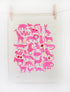 This is a risograph print of Leah's "creatures" in bright pink, dark red, and yellow. Printed in Asheville, North Carolina by Woolly Press. This print features animals of all kinds including a meerkat, lynx, lion, rabbit, tiger, koala, sloth, zebra, fox, llama, snake, otter, and komodo dragon among several others.