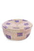 Wolof women in Senegal weave this purple and lavender storage container by binding cattail stalks with colorful strips of plastic purchased as salvaged end cuts at a mat factory in Dakar.